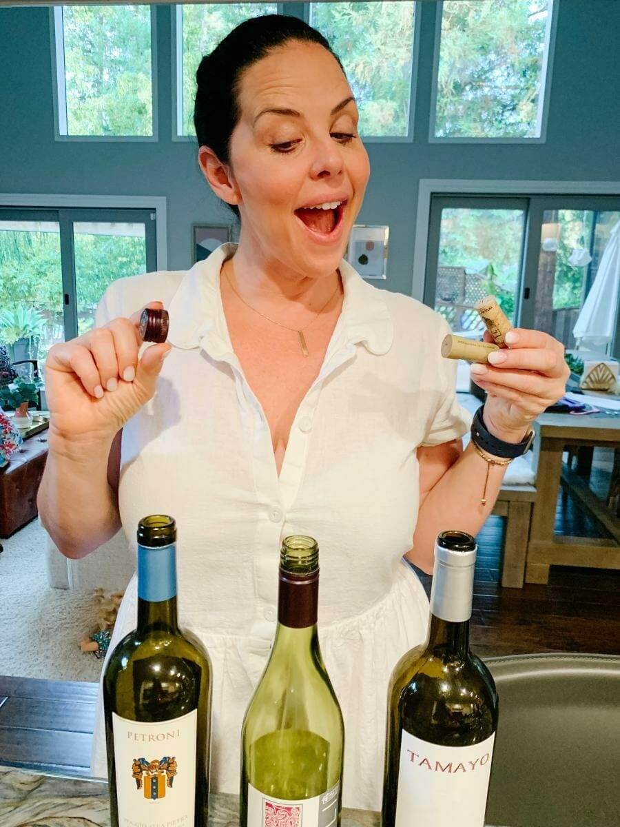 I picked out three bottles that we had in our cellar, one with real cork, one synthetic and one twist off. My first observation is that my “beliefs”, as bullet-ed above are SO wrong. The Petroni Vineyards Brunello, the most expensive at around $60 a bottle, had the Synthetic Cork!! The Riviera Pinot Noir from Sonoma County, around $20 per bottle had the twist off and I picked a Tamayo Red Wine from Contra Costa County, also around $20, that had the real cork.